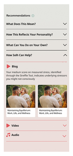 Get seamless access to Streffie via mobile devices or web platforms. Track stress levels daily to gain insights into stress patterns anywhere, anytime, through the Solh app on mobile. Whether at home or at the workplace, Streffie tracks one’s stress, offers personalized insights leveraging advanced facial recognition technology. With the Solh app, one gets the well-being toolkit comprising effective solutions, including the Employee Wellness Program.